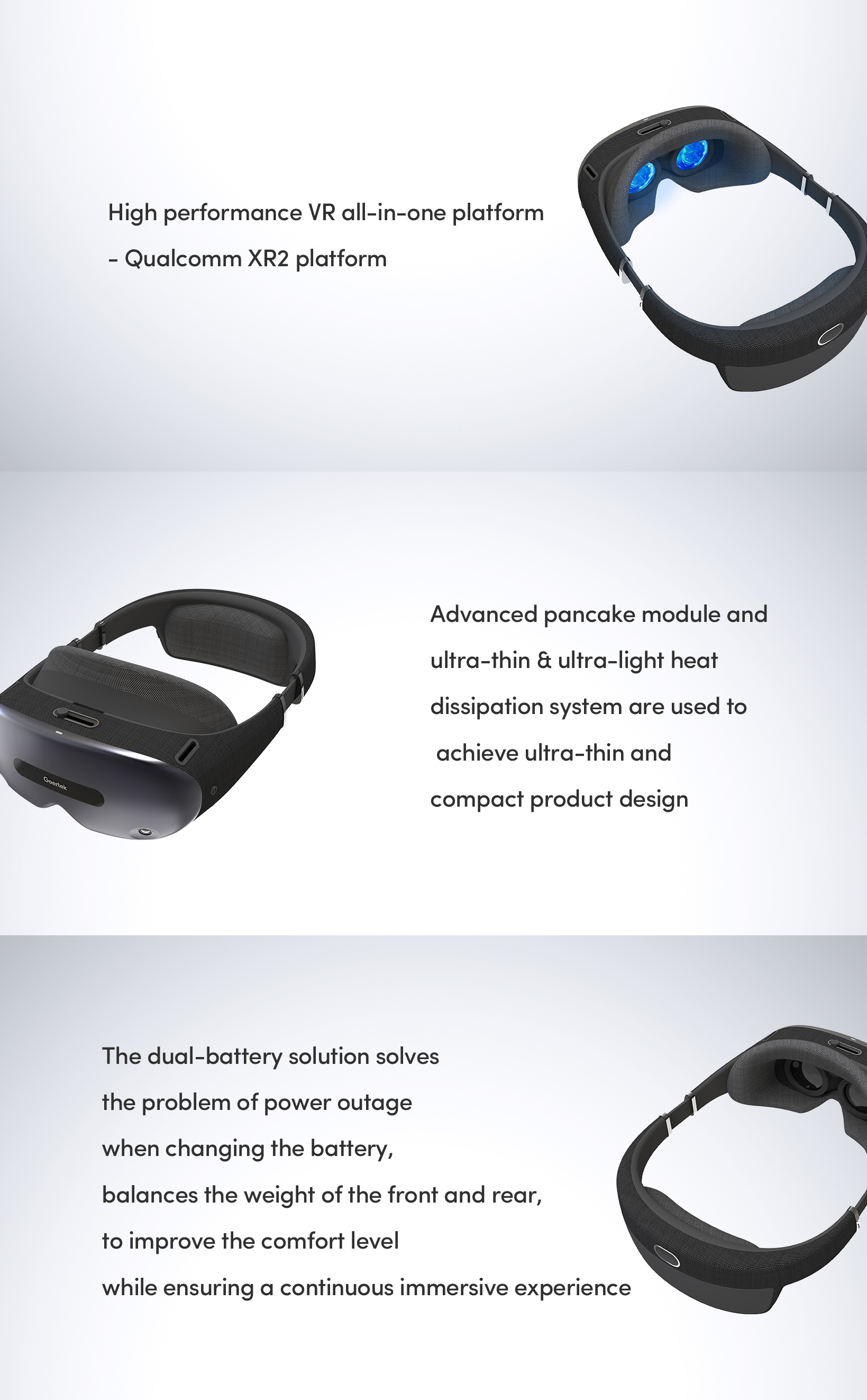 ■ Advanced pancake module and ultra-thin & ultra-light heat dissipation system are used to achieve ultra-thin and compact product design ■ IPD adjustment, myopia adjustment and 6DoF tracking, eye tracking , see-through and other modular technology solutions ■ Near ear acoustics ensures comfort while reducing sound leakage ■ The dual-battery solution solves the problem of power outage when changing the battery to improve the comfort level while ensuring a continuous immersive experience