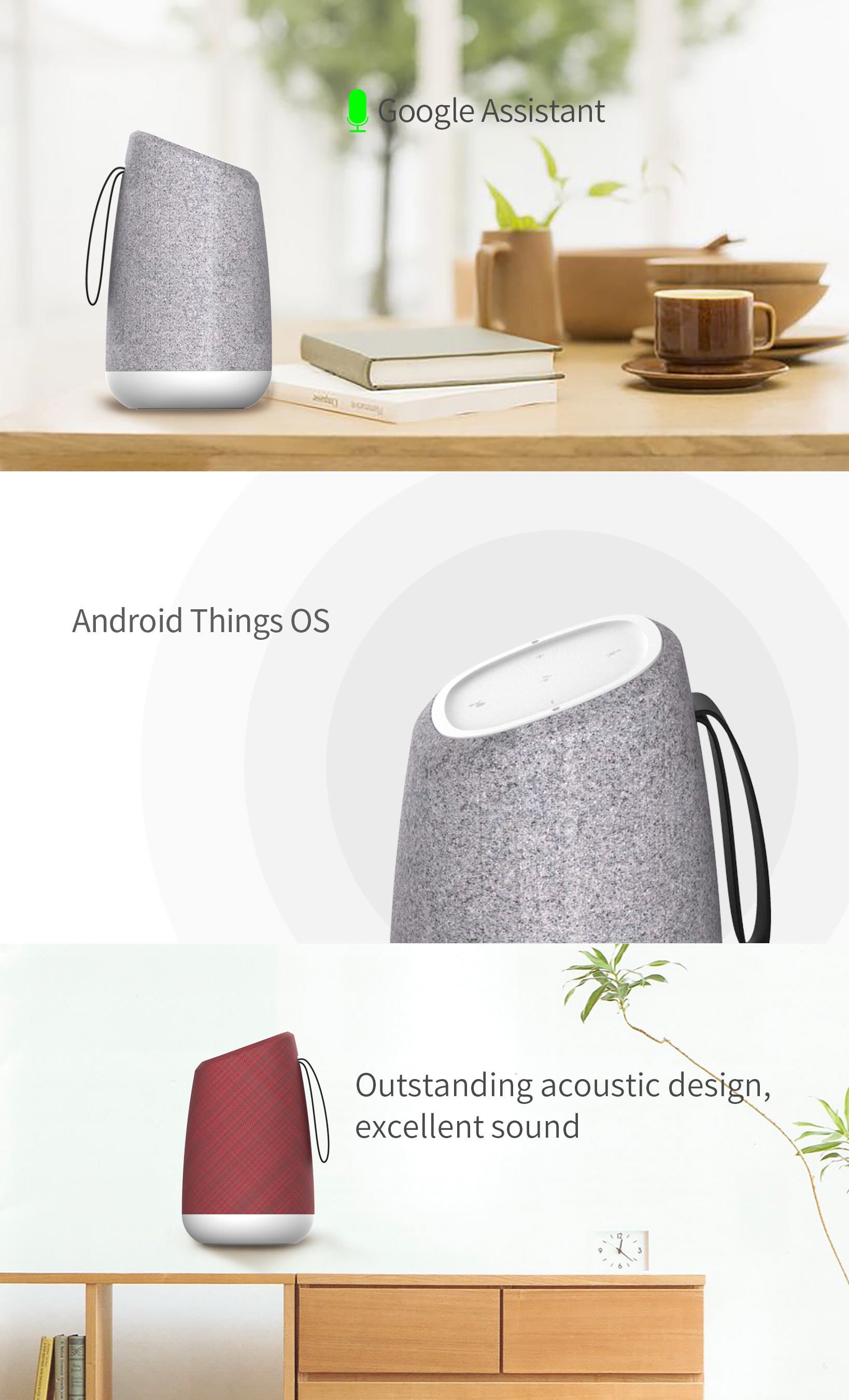 ■ androidss Things OS ■ Cloud–enabled Speech Recognition ■ Far-Field Speech Enhancement with high performance mic array ■ 2" full range, acoustic lens and 2* passive radiator; 360 degree full-room sound, excellent sound quality. ■ Google cast For Audio ■ Wi-Fi & BT